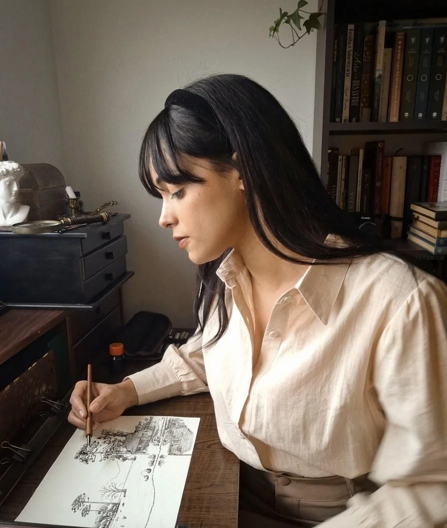 Dyene Corrêa is a Brazilian illustrator and visual artist with a background in Graphic Design, whose work is rooted in the visual and literary sensibilities of the nineteenth century, particularly the Romantic period, extending into the early twentieth century. Her practice is defined by intricate linework and dense cross-hatching, primarily executed through pen and ink using fountain pens, dip pens, and fineliners, with occasional explorations in painting.